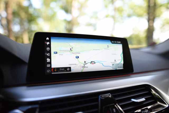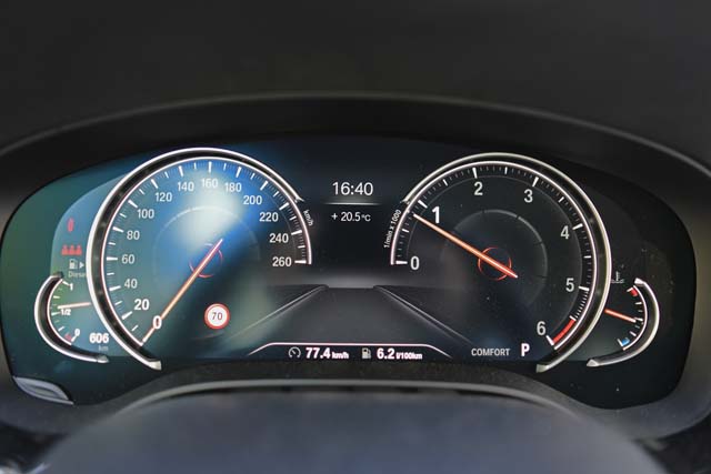 Det finns styrkor och svagheter hos BMW:s instrumentering. Det märks dock att fullt fokus lagts på den normala och vardagliga körningen samt att instrumenteringen ska visa det som främst behövs när bilen körs, ganska självklart egentligen! En extra bra detalj, beräknad körsträcka till tom tank visas hela tiden bredvid bränslemätaren, varför gör inte flera så? Visning av hastighet, varvtal m.m. är som brukligt hos BMW i topp även i nya BMW 5-serien. Grafiken är snygg men sparsam och sticker inte i ögonen, det är en konst att presentera information utan att färgerna väller fram för mycket, BMW har lyckats föredömligt bra. Det går också att få hastighetsvisning med siffror. Det är först när man ska bläddra i de djupare menyfunktionerna via den större informationsdisplayen i bilens mitt som det blir lite pyssligare med BMW:s fliksystem, här finns det trots allt enklare system på marknaden. ”Hem” läget i denna skärm har utvecklats lite och fått ännu snyggare och tydligare design samt att man på ett enkelt sätt kan välja vilka funktioner som ska synas på skärmen när man kör. Efter att ha studerat detta lite kommer vi fram till att det ursprungliga upplägget som BMW redan valt ändå är det bästa, såklart.