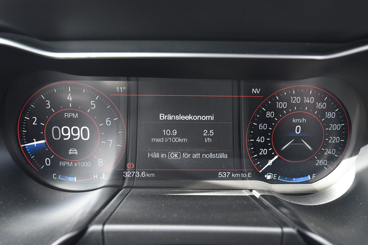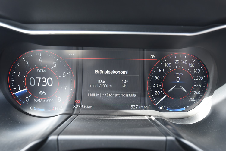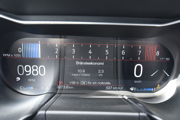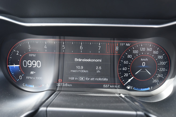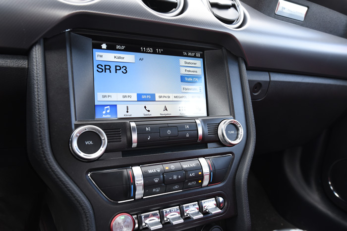 Trots att bilen har hur många knappar på ratten som helst samt även i mittpanelen så är det mesta mycket enkelt att sköta. Ford Mustang känns föredömligt bra användarmässigt. Pekskärmen är stor och lätt att sköta, ja detta är en av de bästa instrumenteringarna vi provat! Bara en detalj, vi saknar möjligheten att se hastigheten med stora tydliga siffror vid normal körning. Hastighet i siffror visas visserligen fast ganska smått i Normal-läget.